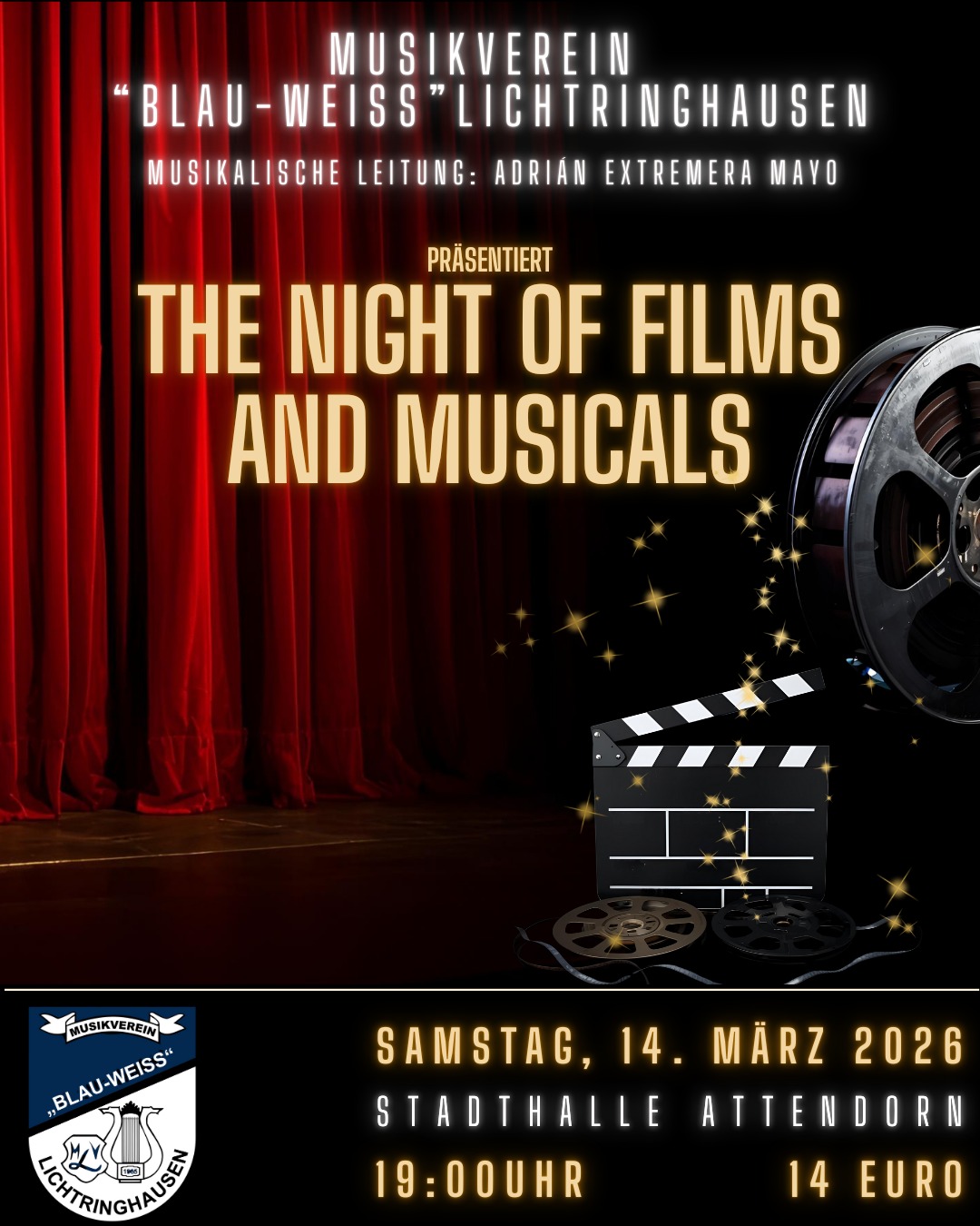 Der Musikverein „Blau-Weiss“ Lichtringhausen lädt zu einem besonderen Konzerterlebnis ein: The Night of Films and Musicals. Unter der musikalischen Leitung von Adrián Extremera Mayo erwartet das Publikum ein stimmungsvoller Abend mit bekannten und beliebten Melodien aus der Film- und Musicalwelt.